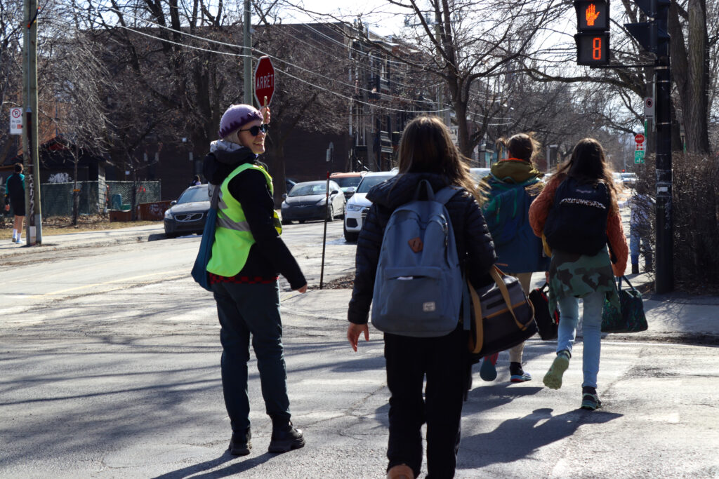 Une brigadière scolaire assure la sécurité des élèves autour de l’école primaire Saint-Pierre-Claver. PHOTO : LAURY-ANN LUCCA